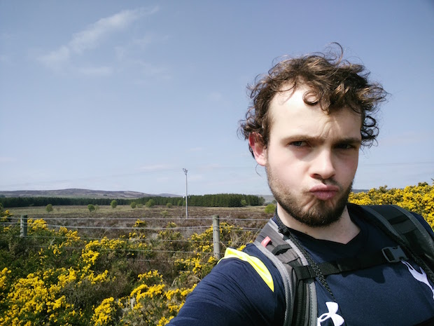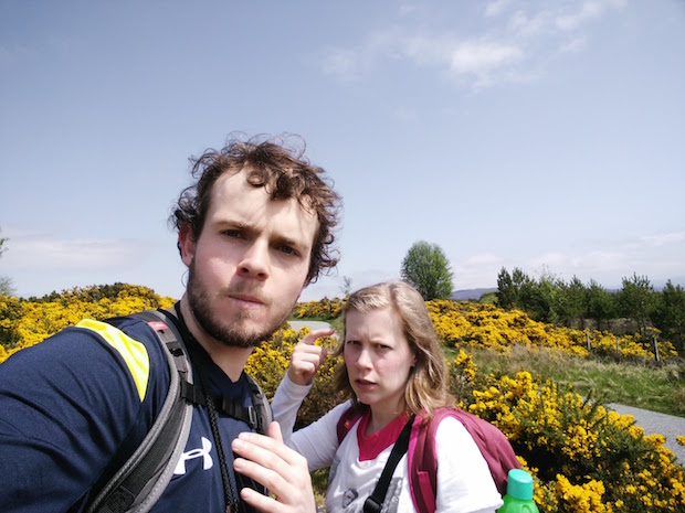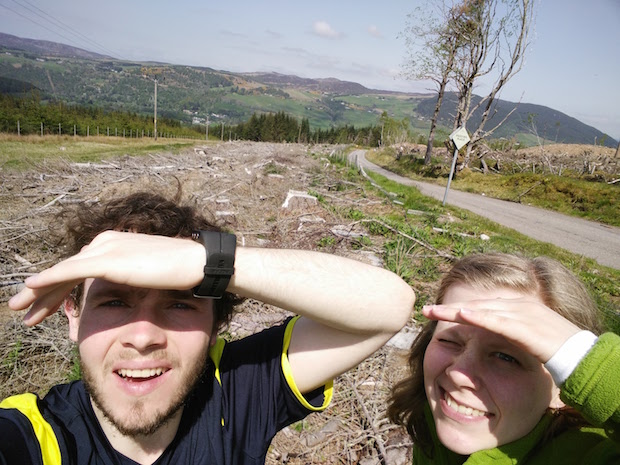 Tegen de middag aan bereikten we niet alleen het hoogste punt van The Great Glen Way, maar kwamen we ook tot de constatering dat Cynthia een wel heel speciaal talent blijkt te hebben. Ze kan namelijk eender welke banale taak verheffen naar een uitstekende graad van stoerheid. Net op tijd kon ik Cynthia verrassen en dat vastleggen op de gevoelig bewegende plaat. Cynthia reageerde met een wel heel flauw mopje: