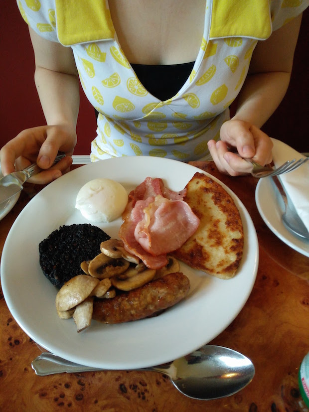 Opstaan ging verrassend genoeg zonder al te veel problemen. Onze vroeg-gaan-dodokes-doen-strategie zat daar ongetwijfeld voor iets tussen. De heerlijke geuren van een stevig Engels ontbijt – pas in de derde B&B zouden we een echt schots ontbijt voor de kiezen krijgen – hielpen daar ook bij. Wat is er beter dan een zware dag beginnen met roerei, spek, een croissant, een zelfgemaakt koekje, vers sinaasappelsap, een pistolet, een worstje en wat vers beleg?